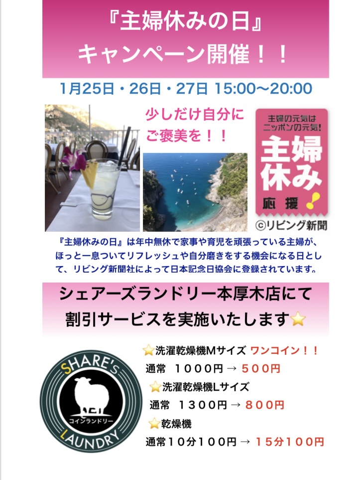 本日は『主婦休みの日』です!!シェアーズランドリー全店でキャンペーン実施中!!