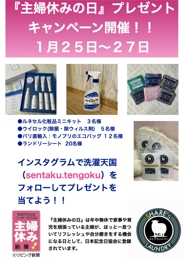 来たる1月25日の『主婦休みの日』に合わせて1月25日〜27日の3日間、洗濯天国がプロデュースするブランドシリーズのシェアーズランドリー(詳細はシェアーズランドリーで検索ください!!)全店舗にて主婦にうれしいプレゼントキ…続きを読む