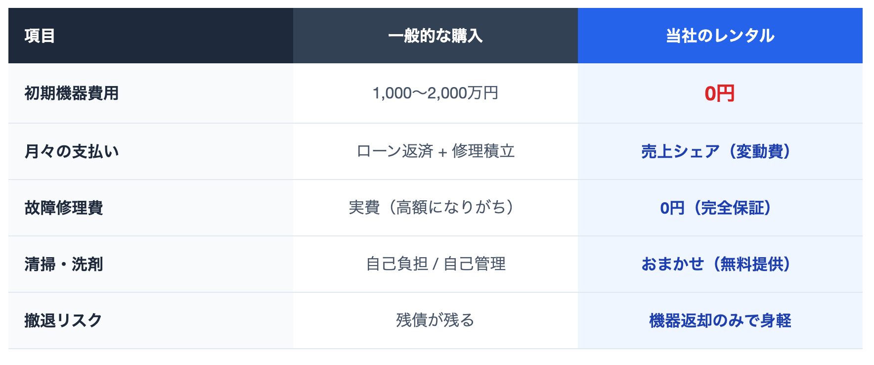 コインランドリー機器の購入費用が一切不要であるほか、導入後の保守メンテナンス費、故障時の修理費、部品代なども0円で提供されます。