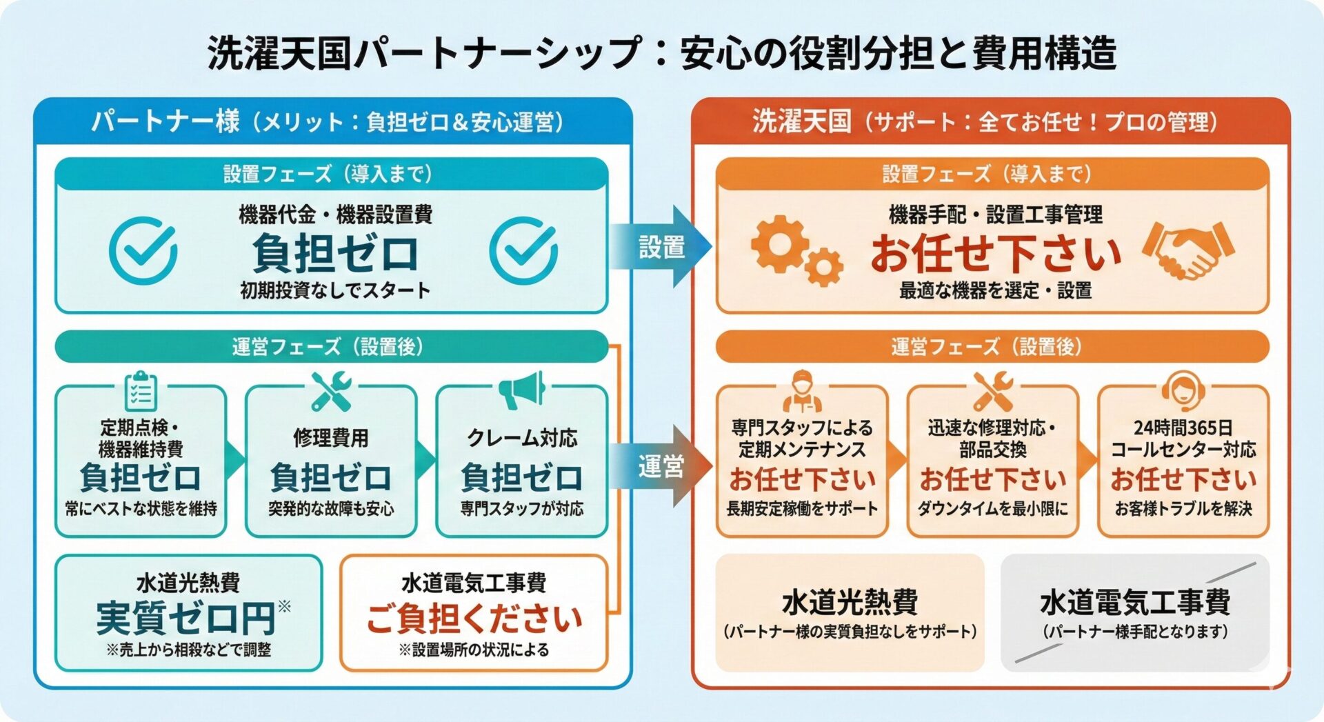 洗濯天国が40年以上運営してきたのランドリー事業から考えた、パートナー様に快適にランドリー運営を行ってもらうためのサービスです。