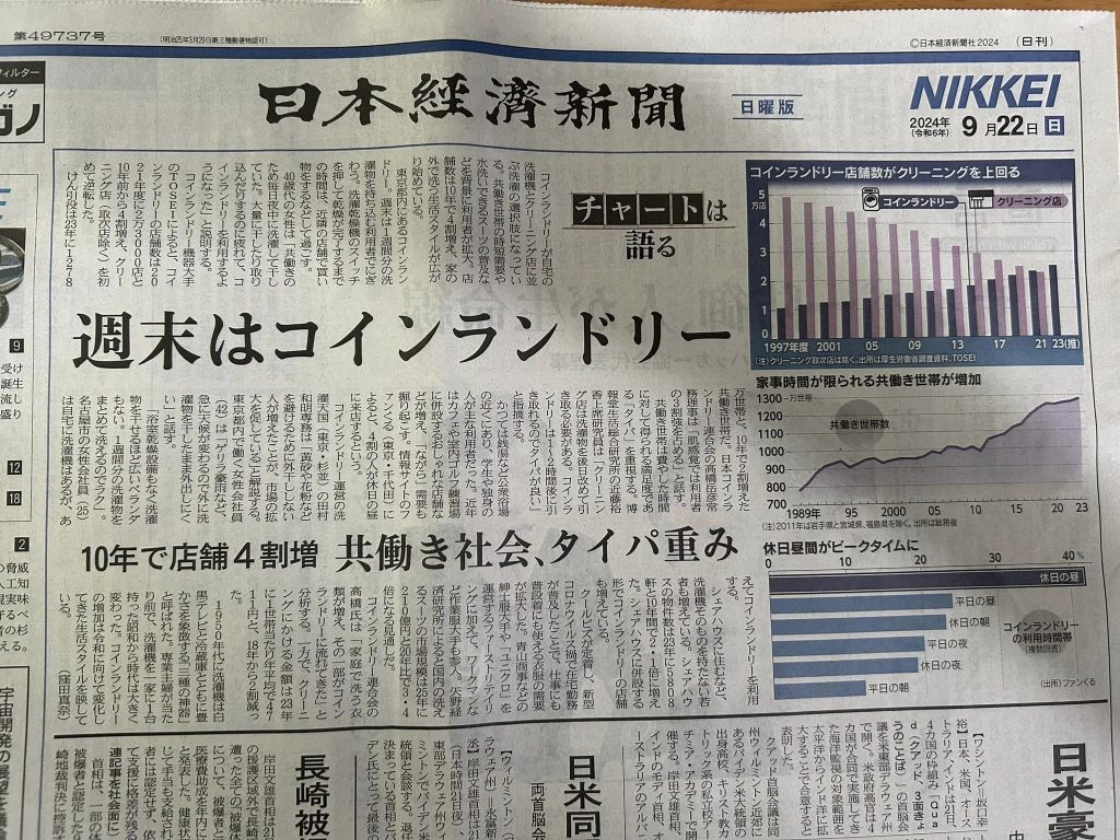 【50年周年♪】とうとうコインランドリーも日経新聞1面記事に!! webadmin | 2024年10月16日 日経新聞の1面記事にクリーニング店とコインランドリー店の店舗数が逆転したという記事が出ました。 弊社のコメントも掲載されておりますので読んでみてください! コインランドリー CoinLaundry, マスメディア 報道 Press タグ: 日経新聞, 週末はコインランドリー