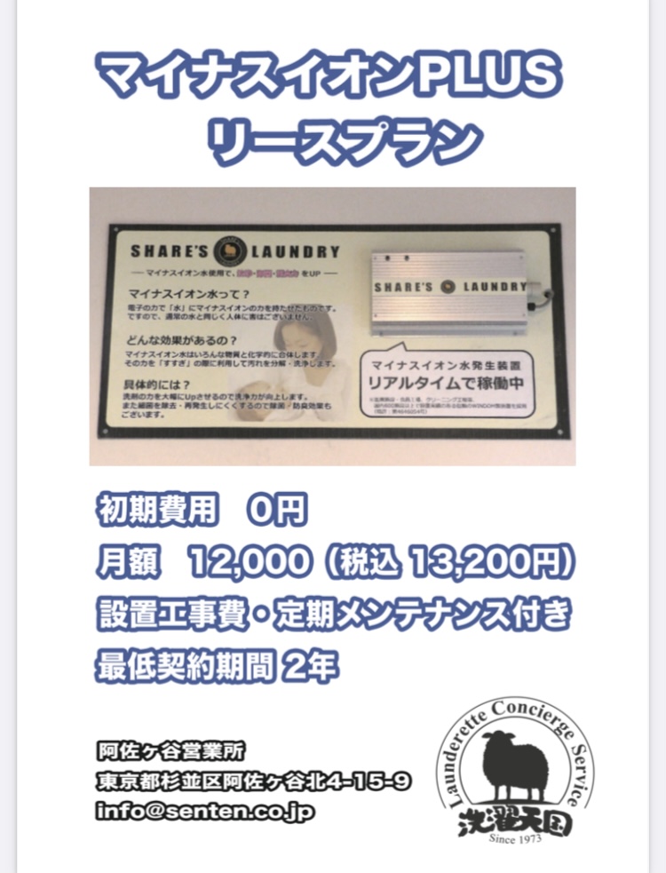 弊社が手がけるシェアーズランドリーで導入しているマイナスイオン発生装置「マイナスイオン水PLUS」。 水道水をマイナスイオン水に変換することで、洗浄力UP・除菌・消臭効果があります。排水管や洗濯槽内の匂いもなくなり、清潔…続きを読む