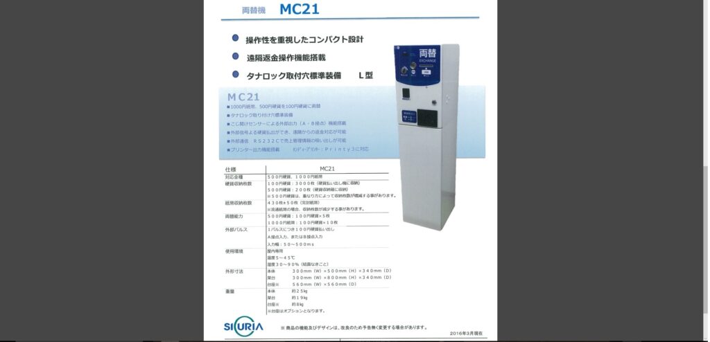 勉強しまっせ~○○の天国。 両替機MC-21 を4月末より発売。1000円札、500円硬貨対応可。