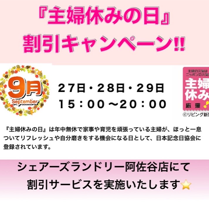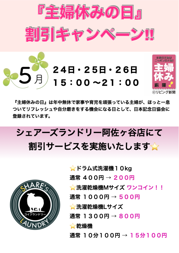 本日は『主婦休みの日』です!!シェアーズランドリー全店でキャンペーン実施中!!